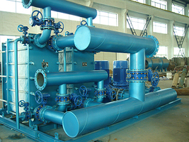 換熱機組是把一系列的零部件組裝起來,作為一個產品出廠銷售。用戶把換熱機組放在換熱站里,將管路和電路連接起來,就可以進行熱交換工作。 我公司生產的換熱機組,是經過優化設計的系列產品,零部件安裝布置合理,結構緊湊占地面積小,運行可靠,換熱效率高。 換熱機組主要的基礎部件是換熱器、水泵、除污器、閥門、電器控制等。根據用戶的要求,也可以增加一些其它附屬設備和部件,電氣控制也可以根據要求設計成自動化程度不同的控制系統。